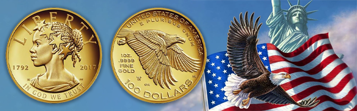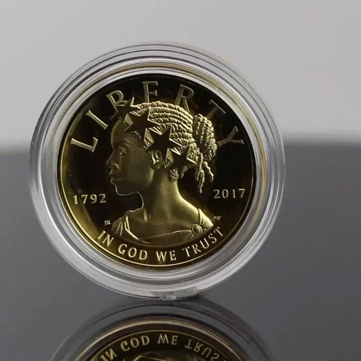 The obverse of the gold coin displays the profile of Lady Liberty with African-American features for the first time on a U.S. coin, wearing a crown of stars. Inscriptions are "LIBERTY", "1792", "2017", and "IN GOD WE TRUST".