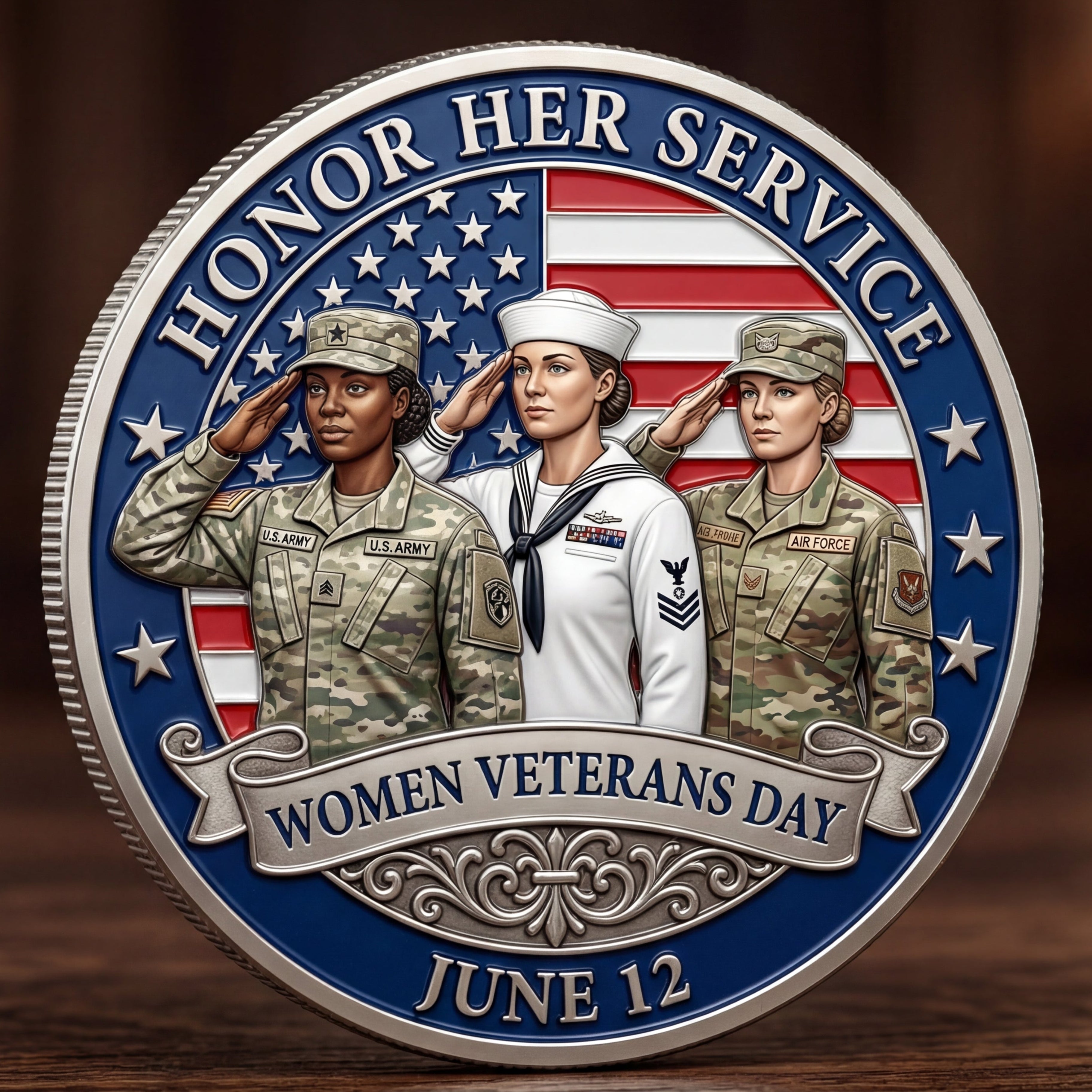 Set against the American flag, the design highlights patriotism, honor, and national pride. The inscription “HONOR HER SERVICE” crowns the top, while “WOMEN VETERANS DAY” and “JUNE 12” ground the coin in its commemorative meaning. 🇺🇸